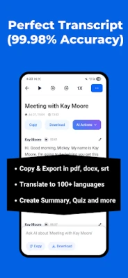 Създаден да предложи безупречно изживяване, 1 Transcribe е обучен с впечатляващите 680 000 часа многоезични данни, гарантирайки супер висока прецизност при преобразуването на глас в текст. С лекота можете да качвате аудио и видео файлове във всякакви формати, да записвате директно или да импортирате съдържание дори от YouTube. След като транскрипцията е готова, експортирайте я в предпочитани от вас формати като PDF, DOCX, TXT или SRT за удобно споделяне и архивиране. Освен това, 1 Transcribe поддържа транскрибиране на над 100 езика и диалекта, което го прави идеален за глобални екипи и международни проекти.