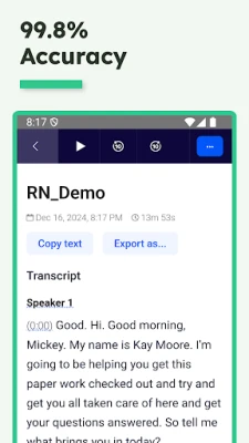 Уморени ли сте от безкрайното водене на записки и ръчното транскрибиране? 1 Transcribe променя правилата на играта, превръщайки се във вашия незаменим AI съюзник за преобразуване на глас в текст и повишаване на продуктивността. Независимо дали става въпрос за бизнес срещи, важни лекции или лични гласови бележки, 1 Transcribe превръща всяко изговорено слово в прецизен писмен текст с ненадмината точност и светкавична скорост. Позволете на интелигентността на 1 Transcribe да освободи вашето време и да трансформира начина, по който работите.
